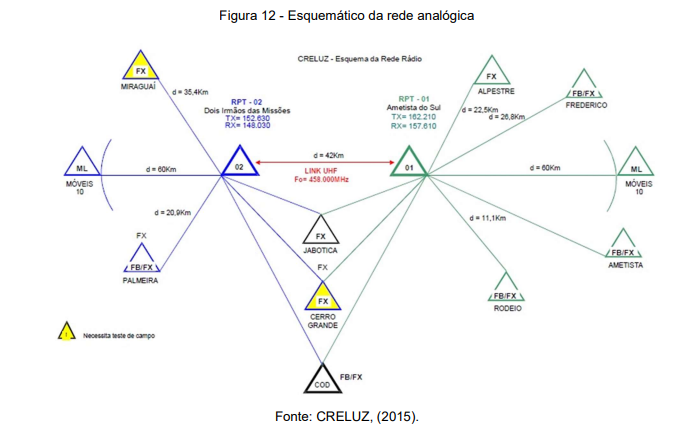 Pode-se destacar que mesmo a CRELUZ contratando um pacote de internet superior ao necessário para a banda requerida pela comunicação dos sites (1Mbps), por vezes a internet perdia seu sinal, derrubando assim o sistema. Isto era mais grave na repetidora máster, deixando assim todo o sistema fora do ar, pois é uma topologia estrela como mostra a Figura 28 obtido de informações do Manual de Projetos Técnicos da Anatel (ANATEL, 2003). Este sendo o problema mais recorrente o qual por várias vezes foi necessário reinicializar a repetidora ou chamar a manutenção da provedora de internet. Para resolver este problema foi contratado uma outra provedora de internet na repetidora máster, a qual atende o ponto por fibra óptica, não tendo mais queda no sinal e por consequência dando confiabilidade ao sistema. Não tem um log de falhas ou algo assim para acrescentar o tipo de problema?