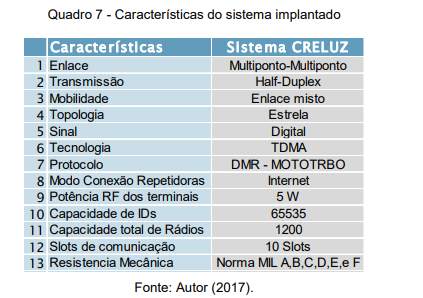 As principais características do sistema implantado estão descritos no Quadro 7 a seguir.