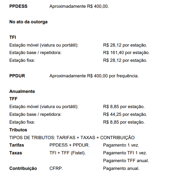 - PPDUR (Preço Público pelo Direito de Uso de Radiofrequência). A fórmula que calcula estes valores é interna da Anatel, baseada na resolução n°68 de 20/11/1998. Pagamento: uma única vez, no ato da outorga das licenças. Incide em renovação.