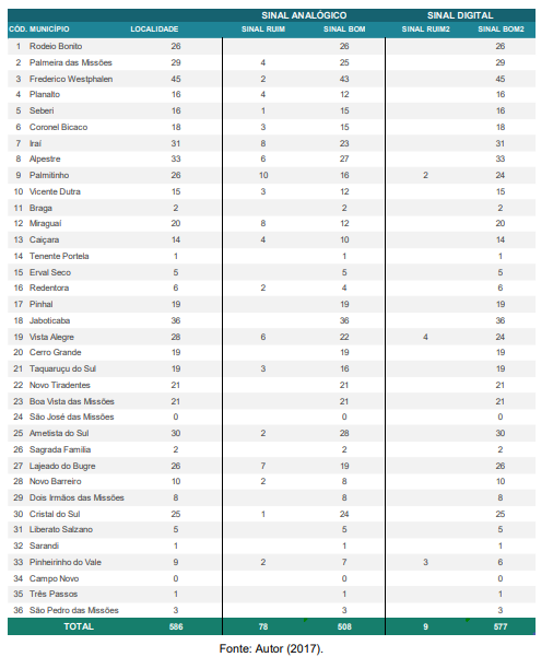 Com os dados coletados na pesquisa obteve-se que com o sinal analógico na área de abrangência da CRELUZ em 78 localidades não possuía comunicação, com o sistema digital apenas 9 localidades, conforme demonstrado na Figura 31