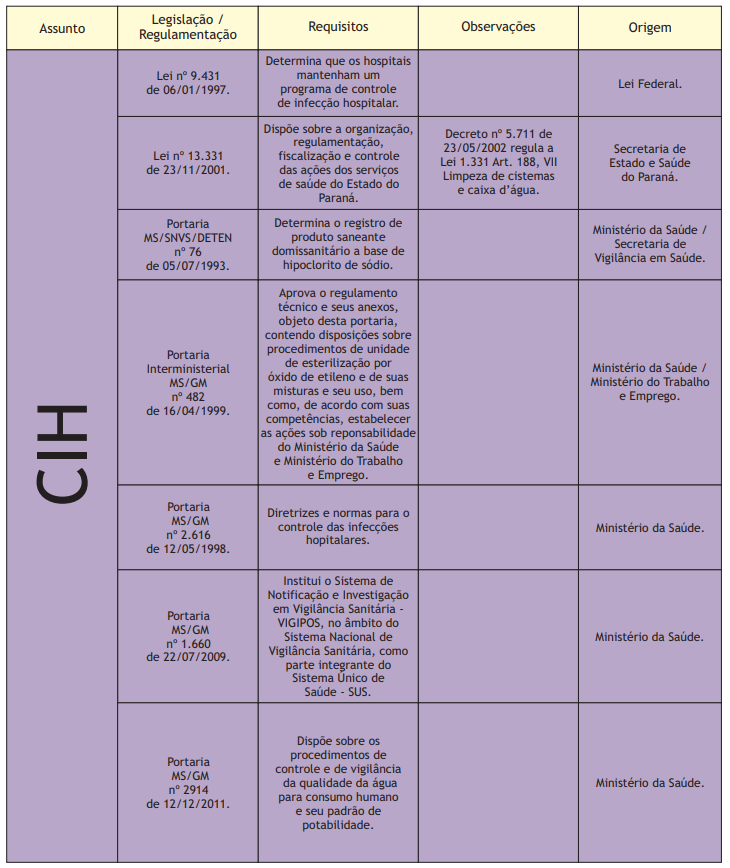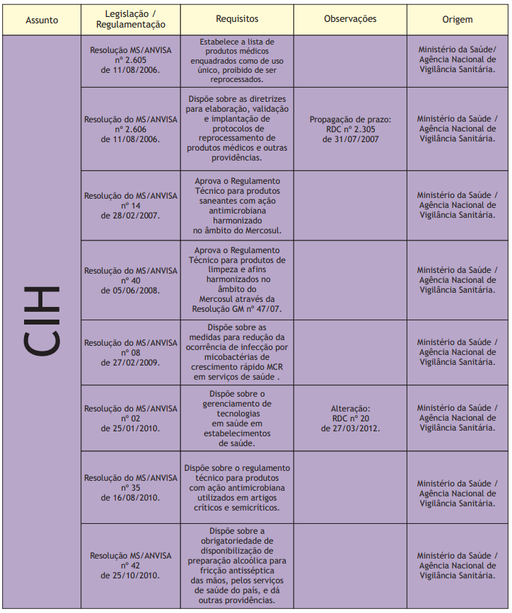 Controle de Infecção Hospitalar - Legislações e requisitos relacionados ao CIH, saneantes e germicidas, reprocessamento de materiais e gerenciamento de risco;
