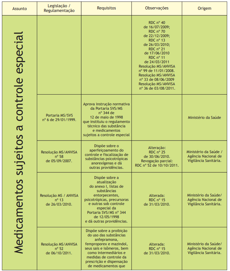 Medicamentos sujeitos a controle especial - Legislações e requisitos relacionados a medicamentos sujeitos a controle especial; foram relacionadas apenas as atualizações dos últimos dois anos.