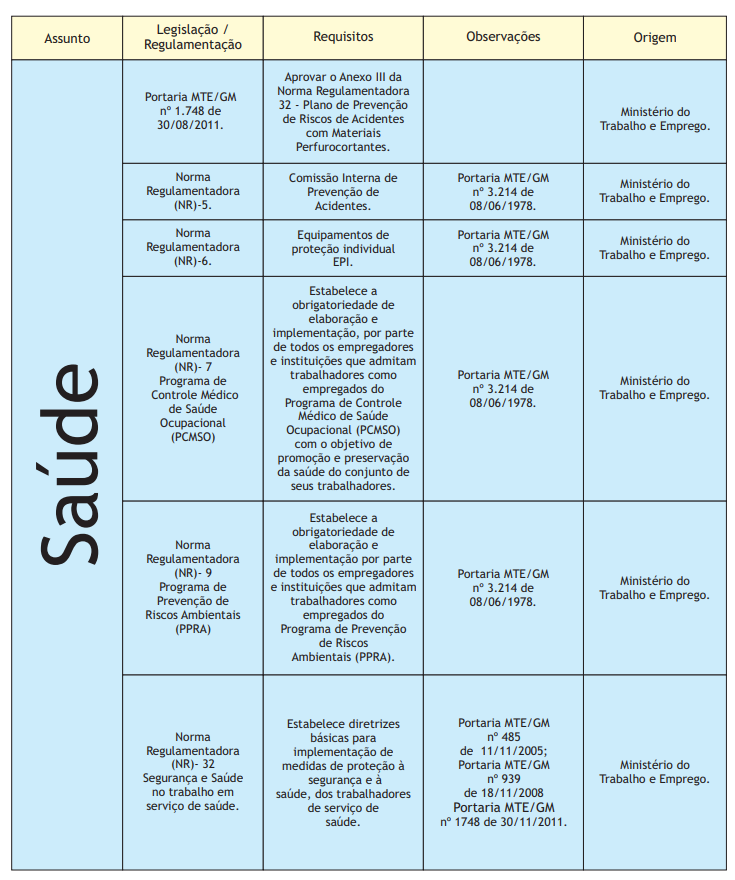 Saúde - Legislação e requisitos relacionados aos Serviços de Saúde e à Saúde Ocupacional;