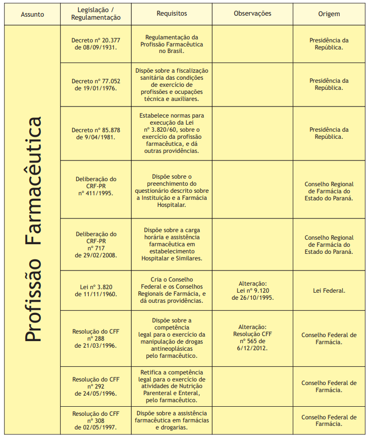 Com o objetivo de contribuir com os farmacêuticos hospitalares, a Comissão de Farmácia Hospitalar (CRF-PR) elaborou um encante citando as legislações federais e estaduais vigente aplicáveis ou relacionadas à Farmacia Hospitalar e Serviços de Saúde.