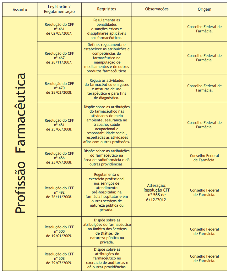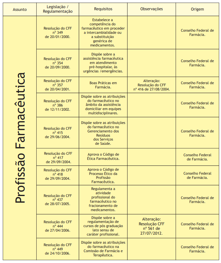 Profissão Farmacêutica - Legislação e requisitos relacionados à Responsabilidade Técnica, ao âmbito Profissional e Aconstantes atualizações que podem ser Código de Ética da Profissão Farmacêutica;