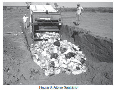 Os aterros sanitários (Figura 8) são uma alternativa para o destino final dos RSU. São áreas preparadas, uma espécie de piscina de lona, onde os resíduos são dispostos e logo cobertos com terra. Quando a célula, o buraco onde foi jogado o lixo, estiver cheia, será fechada com uma manta especial, isolando aquele material. Deve haver medidas de controle para identificar se não há vazamento na célula, pois isto pode contaminar o lençol freático. Em algumas regiões metropolitanas existe o aproveitamento dos gases para a geração de energia, permitindo inclusive a comercialização dos créditos de carbono, tema já abordado na Unidade 1.