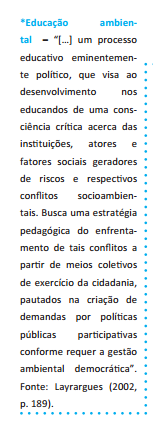 A cada dia e a cada ação que desenvolvemos, nos tornamos mais conscientes. Este material é mais uma oportunidade de, juntos, analisarmos os problemas socioambientais e as alternativas para superá- los. A esfera pública está muito mais próxima do nosso cotidiano do que se imagina, pois o poder público é responsável pelo recolhimento do lixo da nossa casa, pelo abastecimento ou controle de quem nos abastece com água e energia, pela gestão do transporte público, do trânsito por onde passamos, enfim, são muitas as oportunidades que temos para analisar e propor alternativas. Vamos vincular a teoria com a prática, com a realidade da sua cidade, do seu bairro e da sua casa.