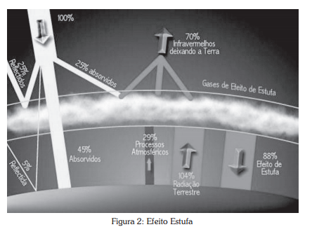 O Efeito Estufa é termo dado ao aquecimento do planeta Terra devido ao espessamento da camada de gases localizada na atmosfera. Trata-se de um processo natural e importante para manter a vida na Terra, mas nas últimas décadas houve um aumento desta camada de gases, provenientes das emissões dos automóveis (CO2 ), das indústrias e queimadas, entre outros. O resultado disto é que parte dos raios infravermelhos refletidos pela superfície da Terra é absorvida por esta camada e parte é refletida novamente para a terra, aumentando assim a temperatura do planeta.