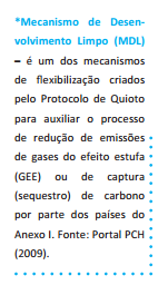 • Mecanismo de Desenvolvimento Limpo (MDL)* – O CDM (Clean Development Mechanism), traduzido para MDL, tem como objetivo a diminuição da emissão dos gases causadores do efeito estufa, criando um mecanismo através do qual as partes não incluídas no Anexo I, enquanto buscam alcançar o desenvolvimento sustentável, auxiliam os integrantes do Anexo I no cumprimento de suas metas de limitação de emissões, de modo que seja atingido o objetivo do Protocolo.
