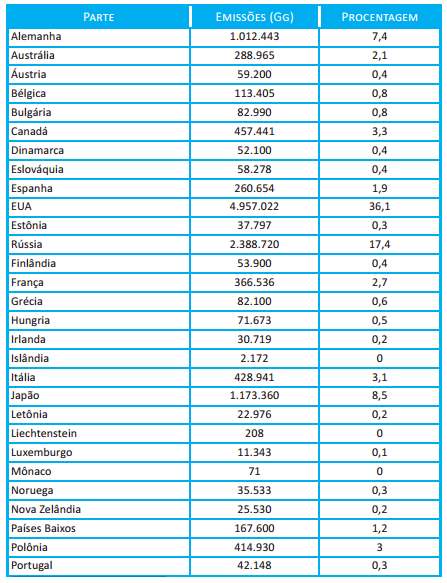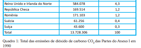 O Protocolo de Quioto dividiu os países membros em dois grupos. Os países industrializados, que são os maiores responsáveis pelo efeito estufa, formam o grupo denominado “Anexo I”. O segundo grupo é formado pelos demais países, ou seja, os países subdesenvolvidos ou em desenvolvimento. O Quadro 1 apresenta os países integrantes do Anexo I, quanto cada país emitiu de gases em 1990, e o quanto isso representa proporcionalmente da emissão total.