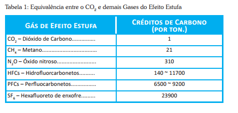 As quantidades de gases causadores de efeito estufa são calculadas levando-se em consideração as quantidades equivalentes de CO2 . Em outras palavras, os GEE são quantificados de acordo com seu potencial de aquecimento global em relação ao dióxido de carbono. Por esta razão, os créditos de carbono são cotados por tonelada de dióxido de carbono-equivalente (CO2 e). A relação entre o CO2 e outros gases responsáveis pelo efeito estufa é demonstrada na Tabela 1.