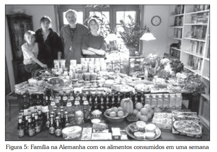 A diferença do padrão de consumo fica evidente nas Figuras 5 e 6. Na Figura 5, uma família na Alemanha, com quatro pessoas, gasta cerca de US$500,00 por semana com a sua alimentação, predominantemente de produtos industrializados.