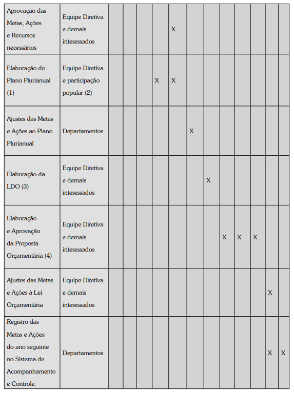A agenda do ciclo completo do planejamento pode ser identificada de acordo com a seguinte tabela, cabendo adaptações conforme as necessidades do órgão/entidade.