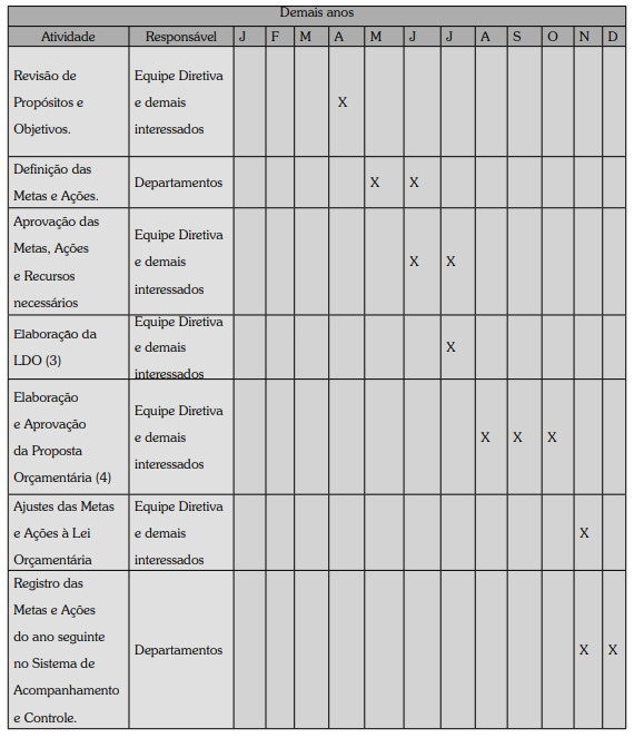 1. Planejamento quadrienal ou estratégico: elaboração de janeiro a abril do primeiro ano de mandato, valendo para os próximos quatro anos.