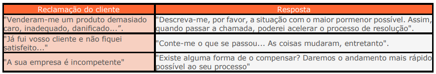 - Aceitar e ouvir a reclamação: o atendente deve ouvir até ao fim, responder prontamente e nunca dizer que o cliente não tem razão. Objeções por parte de quem atende significam que a empresa ou pessoa tem algo a esconder. O silêncio ou falta de resposta serão interpretados como formas de retardar o contato.