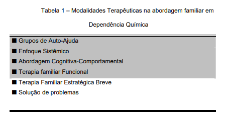 Na realidade, a abordagem familiar em dependência química como modalidade de tratamento é recente. E como mencionado, vários modelos de atuação estão em operação, sendo que a maioria dos terapeutas familiares vem descobrindo a sua própria mistura, utilizando uma gama de ideias e práticas diferentes (04). Indiscutivelmente, a família é um fator crítico no tratamento e sua abordagem é um procedimento fundamental nos programas terapêuticos (34). Contudo, até o momento não foi estabelecida uma abordagem de maior eficácia nesta área. A tabela 1 mostra as várias modalidades terapêuticas _ Tabela 1.