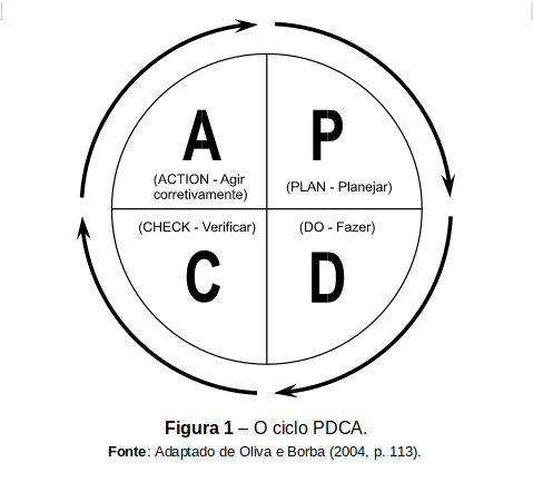 Conforme os textos de Martins e Cerqueira (1996) e Camacho (1998), todo este processo pode ser visto como um PDCA (Figura 1 e 2), que é um ciclo de atividades sucessivas, usado cada vez que se deseja implantar um processo ou atividade, ou manter um padrão estabelecido, ou melhorar um produto ou serviço, ou solucionar um problema. O PDCA, de acordo com esses autores, é composto de quatro etapas representadas da seguinte forma: