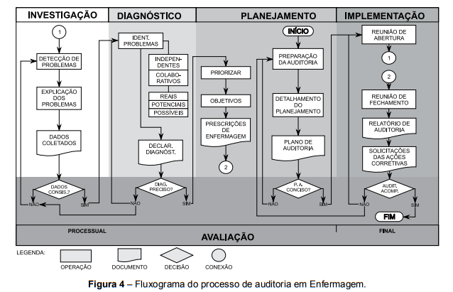 Quando se compara a fase de avaliação do Processo de Enfermagem com a auditoria, podemos verificar que as suas classificações, de alguma maneira, são bastante semelhantes. Elas entendem estrutura, processo e resultados de forma muito eqüitativa.