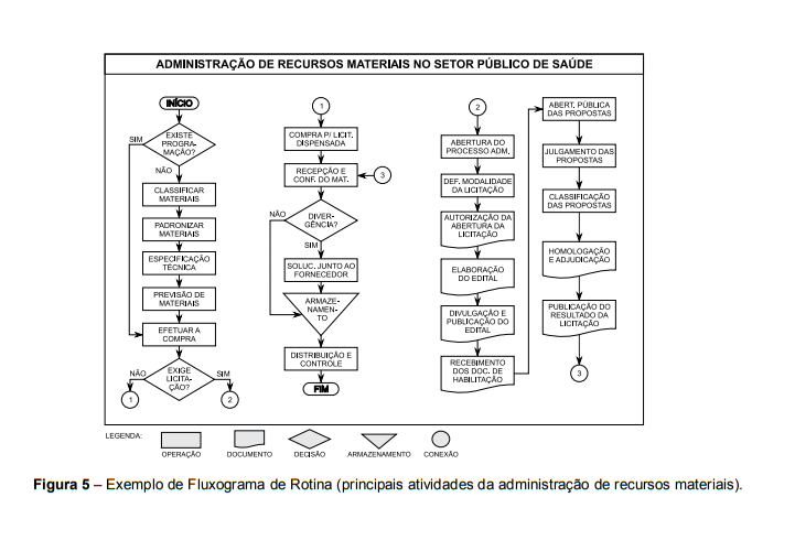 Quando houver necessidade de mapear pequenos processos (que apresentam poucos eventos), ou processos executados em uma única unidade organizacional, é recomendado o uso de Fluxograma de Rotina (Figura 5). Quando existir necessidade de descrever processos mais complexos, envolvendo uma grande quantidade de ações, funções, decisões e unidades organizacionais, recomenda-se o uso de Fluxograma Global ou de Colunas (BALLESTERO-ALVARES, 2000). A Figura 3 exemplifica o uso do Fluxograma Global ou de Colunas para explicar o Processo de Enfermagem, e a Figura 5 exemplifica o seu uso para explanar o Processo de Auditoria em Enfermagem.