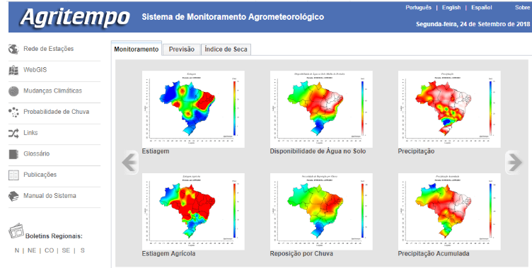 As condições meteorológicas são importantes para sua lavoura desde o preparo do solo até a colheita.A Embrapa desenvolveu o sistema Agritempo, que te ajuda com o monitoramento das condições climáticas.Este sistema disponibiliza mapas de monitoramento, mapas de previsão do tempo, mapas de índice de seca e histórico de chuvas.