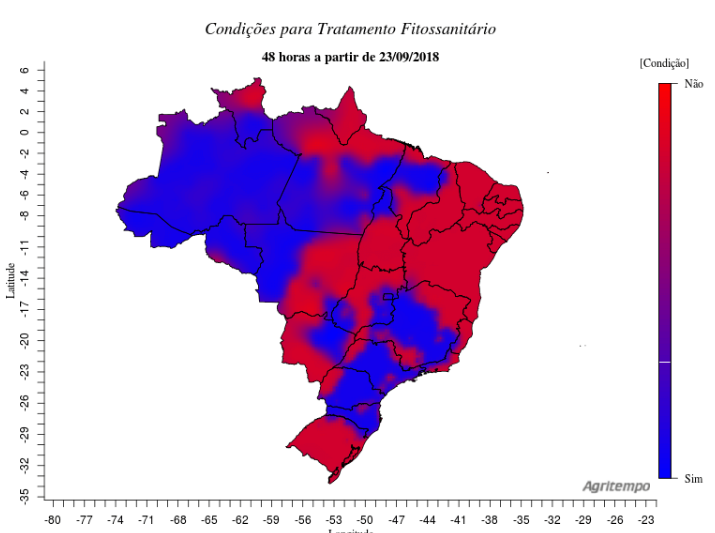 Este sistema também está disponível para o seu celular, assim, você pode ter este aplicativo e acessar de forma bastante rápida.Dessa forma, veja no mapa abaixo algumas das informações que você pode ter utilizando este sistema.O mapa retrata se é necessário o tratamento fitossanitário nas regiões brasileiras para um período de dois dias.
