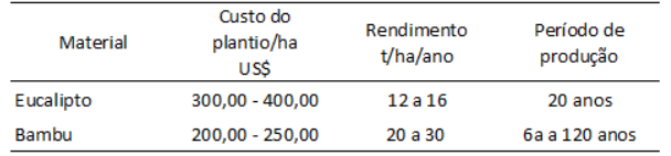 Comparando-se com a madeira de eucalipto, o bambu apresenta uma excelente relação com benefícios em todos os aspectos estudados de custo de plantio, crescimento e rendimento pelo período de produção, conforme Tabela
