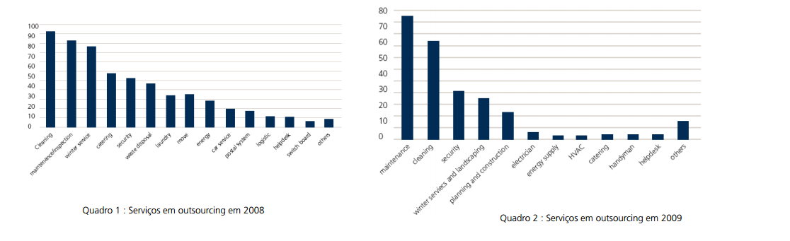 Em 2008, a limpeza foi a área de outsourcing com crescimento mais rápido tendo sido substituída em 2009 pela manutenção tal como ilustrado nos quadros 1 e 2 abaixo.
