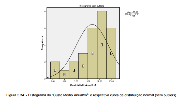 Na figura 5.34. encontra-se o histograma do “Custo Médio Anual/m2”, sem o impacte dos outliers. Continuam-se a verificar desvios entre o histograma e a curva normal, sobretudo na parte central do gráfico. Porém, a distribuição é mais regular quando os outliers são eliminados, o que contribui para uma melhoria dos resultados obtidos.