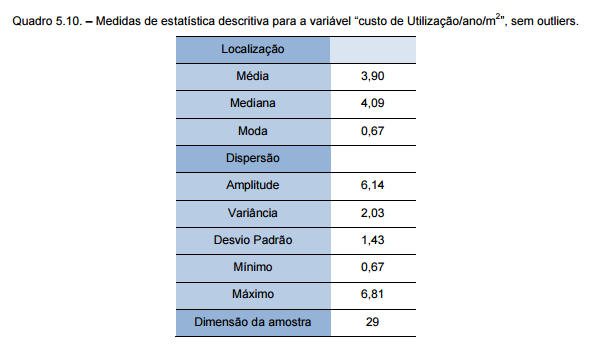 As medidas estatísticas obtidas estão resumidas no quadro 5.10., fruto da análise da variável sem a presença de outliers.