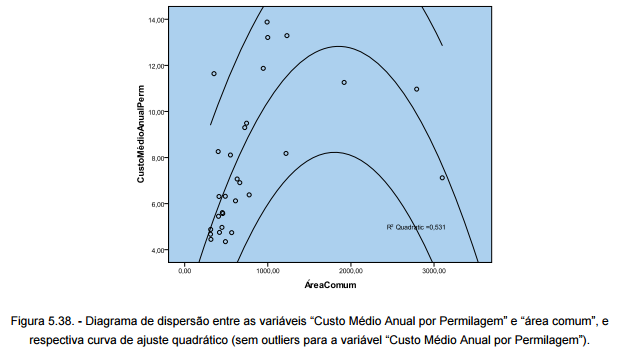 Da mesma forma analisou-se a relação entre o “Custo Médio Anual por Permilagem” e o valor da “área comum”. O coeficiente de determinação máximo obtido é igual a 0,531, para a situação em que se eliminam os outliers da variável “Custo Médio Anual por Permilagem”. O valor é reduzido, podendo-se supor que a relação entre as variáveis existe, mas é moderada.