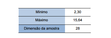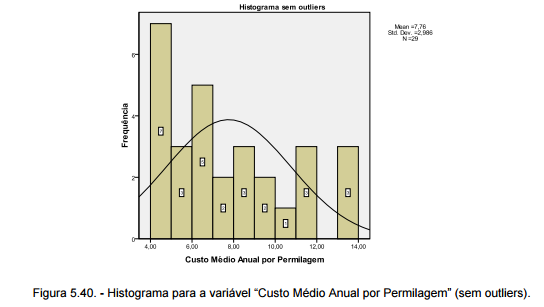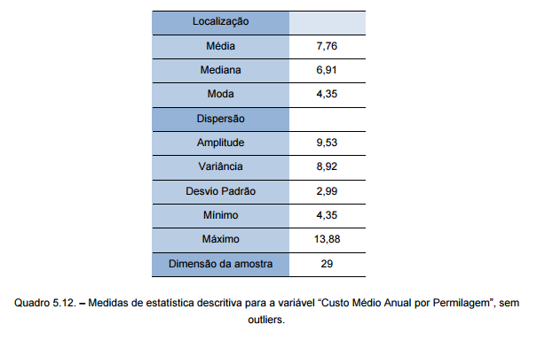 O quadro 5.11. apresenta os valores obtidos para as medidas estatísticas, sem outliers, que permitem avaliar a distribuição com mais clareza.
