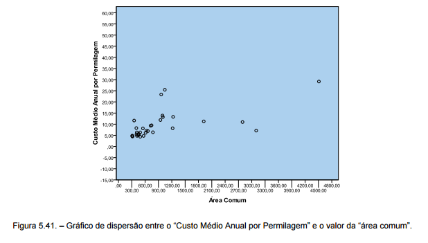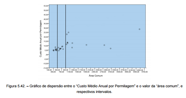 Atentando a figura 5.41., é possível notar uma aglomeração de pontos no lado esquerdo do gráfico, aumentando a sua dispersão à medida que os valores da “área comum” também aumentam. Analisando a tabela onde se encontram os valores das duas variáveis, verifica-se que, salvo raras excepções, quanto maior o valor da “área comum”, maior o valor do “Custo Médio Anual por Permilagem”.
