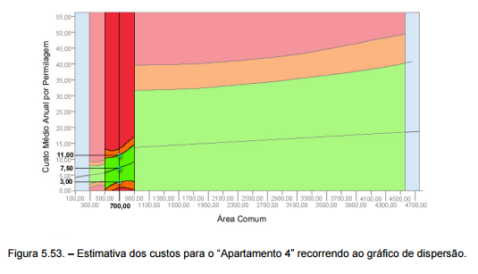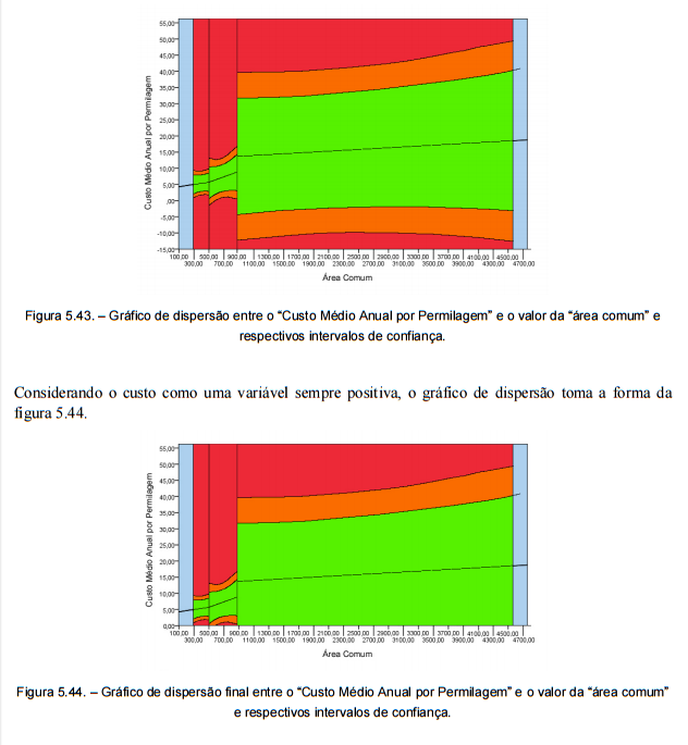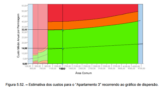 Utilizando o gráfico de dispersão da figura 5.44., é possível determinar em que intervalo de confiança se encontra o valor do custo e certificar o apartamento. O valor da “área comum” do prédio, que corresponde ao eixo das abcissas, condiciona qual dos intervalos a utilizar. O “Custo Médio Anual por Permilagem” é introduzido no eixo das ordenadas.