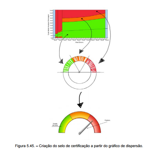 O selo de certificação é, basicamente, metade de um anel onde estão marcadas três áreas de igual valor. Como se vê na figura 5.45., a cor vermelha pertence aos casos em que o custo é superior ao registado para o intervalo de confiança para 99%, o pior cenário do estudo. A cor laranja pertence ao intervalo em que o custo é moderado, e a verde à situação ideal, onde o custo está localizado dentro do intervalo de confiança para 95%.