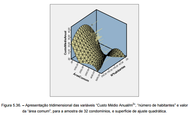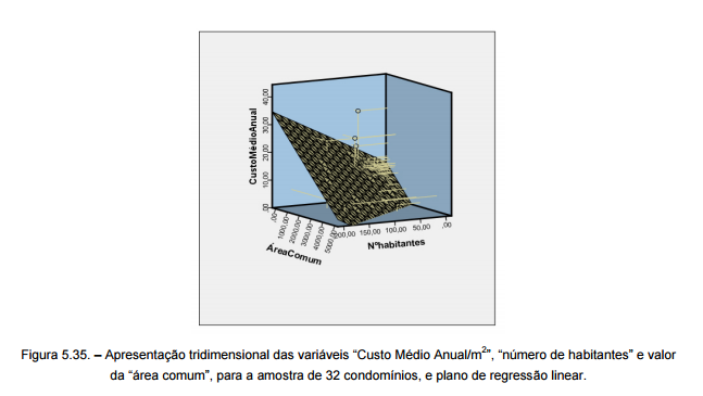 Aproveitando as potencialidades do SPSS, para finalizar o estudo do “Custo Médio Anual/m2 ” foi criado um gráfico de dispersão a três dimensões. Este gráfico estuda a influência dos parâmetros “número de habitantes” e “área comum” no valor do “Custo Médio Anual/m2”, simultaneamente. As regressões bivariadas podem dar mais ênfase a uma das variáveis, portanto utilizar este tipo de gráfico a três dimensões permitirá testar simultaneamente as duas variáveis de forma independente.