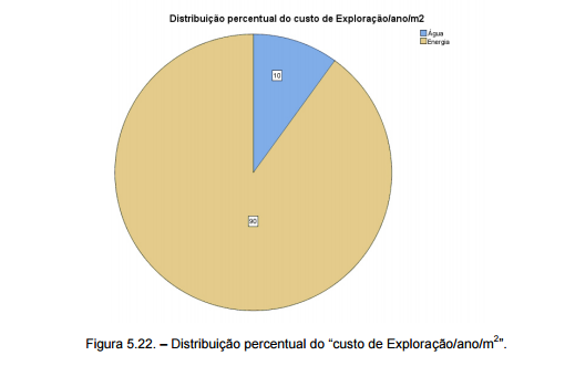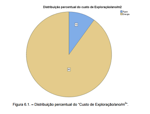Finalmente apresenta-se o gráfico circular com a distribuição percentual do custo total de Exploração. O fator de custo “água” tem uma percentagem igual a 10% no “custo de Exploração/ano/m2 ”, sendo os restantes 90% atribuídos ao consumo de “energia”.