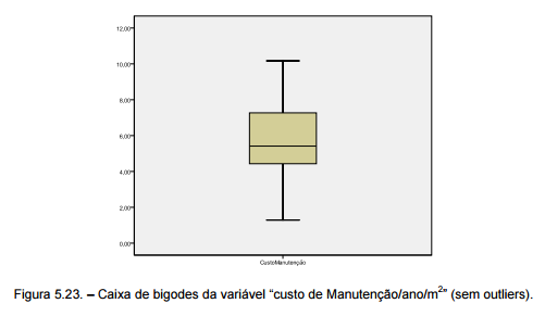 Observando a figura 5.23., verifica-se que a variável “custo de Manutenção/ano/m2 ” tem uma distribuição marcadamente assimétrica enviesada à esquerda, uma vez que a mediana está próxima do valor do primeiro quartil, ou seja, há uma grande concentração de valores de custo inferiores a 5,42 €/ano/m2