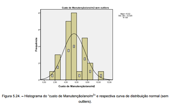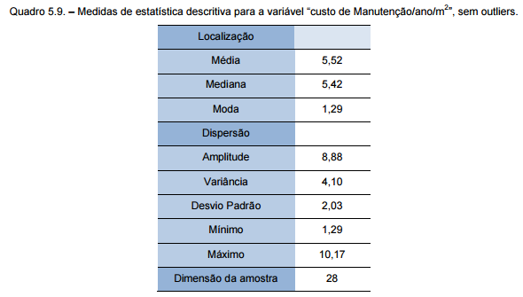 No quadro 5.9. apresentam-se as medidas estatísticas obtidas na análise estatística da variável “custo de Manutenção/ano/m2”.