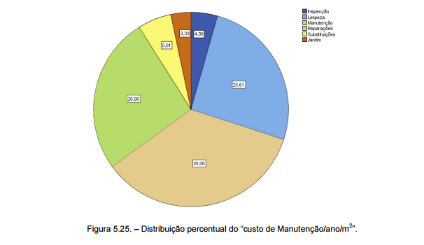 O gráfico circular, representado na figura 5.25., contém a distribuição percentual das componentes do “custo de Manutenção/ano/m2 ”. A maior fatia pertence às operações de” manutenção” (35%), seguindo-se as “reparações” (26%) e a “limpeza” (25,6%). Os restantes componentes, “substituições”, “inspeção” e “jardim” correspondem a 5,6%, 4,4% e 3,3%, respectivamente.