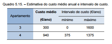 A partir dos valores obtidos no eixo das ordenadas, multiplicando-os pelo valor da permilagem do apartamento, obtém-se um intervalo de custos para o intervalo de confiança de 95% e uma estimativa para o valor médio. Os resultados aferidos encontram-se expostos no quadro 5.15.