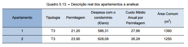 Tendo conhecimento desses valores, dividindo o valor da despesa anual pela permilagem, obtém-se o “Custo Médio Anual por Permilagem” para cada um dos apartamentos em estudo, como se mostra no quadro 5.13.