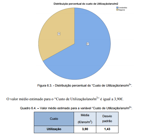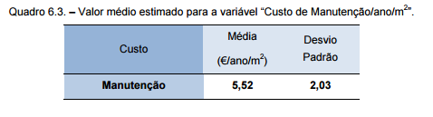 O quadro 6.3. apresenta o valor médio obtido para a variável “Custo de Manutenção/ano/m2”, que é igual a 5,52€.