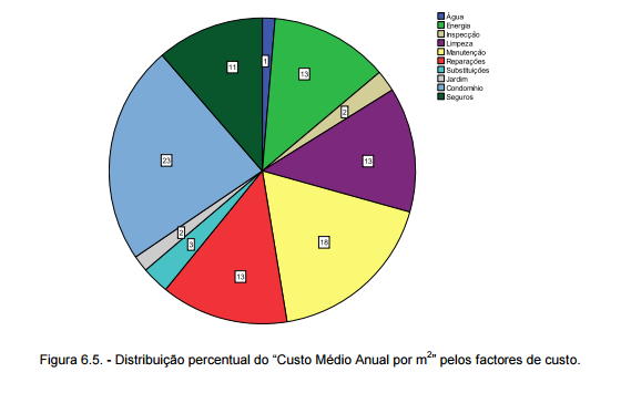 As despesas com o “condomínio” equivalem a 23% do “Custo Médio Anual/m2”. A “manutenção” corresponde a 18%. A “energia”, “limpeza” e “reparações” equivalem a 13% do custo total, cada. O fator de custo “seguros” corresponde a 11% do custo. As “substituições” são 3%, seguida da “inspeção” e manutenção dos “jardins”, ambas com 2%. A menor fatia corresponde aos encargos com o consumo de “água”, com apenas 1% do custo total.