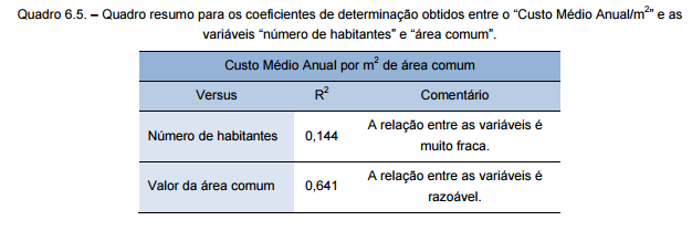 Por outro lado, os valores obtidos para o Ró de Spearman, iguais a -0,038 para a variável “número de habitantes” e -0,562 para o valor da “área comum”, indicam que a última variável tem um peso maior no valor final do “Custo Médio Anual/m2”. Desenvolvendo mais um pouco o resultado obtido, 0,1% do “Custo Médio Anual/m2” é explicado pelo “número de habitantes”, e 32% pelo valor da “área comum”.