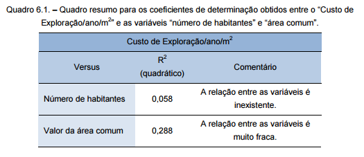 A análise estatística de regressão permite estudar a influência das variáveis “número de habitantes” e “área comum” para este custo. Os coeficientes de determinação, expostos no Quadro 6.1., são reduzidos. Mesmo retirando os valores extremos da amostra, esse valor ainda está longe da unidade. A regressão quadrática não permite aferir uma ligação entre estas duas variáveis e o “Custo de Exploração/ano/m2”.
