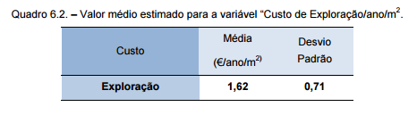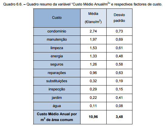 Resumindo, no quadro 6.6 apresentam-se os valores médios de cada fator de custo e o valor médio estimado para o “Custo Médio Anual/m2”, igual a 10,96€.