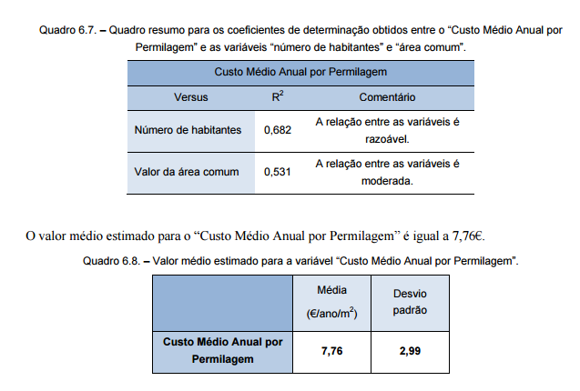 Foi estudada a ligação entre o “Custo Médio Anual/m2” e o “número de habitantes” e a “área comum”. Mais uma vez, os resultados obtidos, apresentados no Quadro 6.5., revelam que a relação entre o custo e o “número de habitantes” é muito fraca. Por outro lado, o coeficiente determinado para a relação entre o “Custo Médio Anual/m2” e o valor da “área comum” é superior, e permite aferir que esta variável tem algum impacto no custo total.
