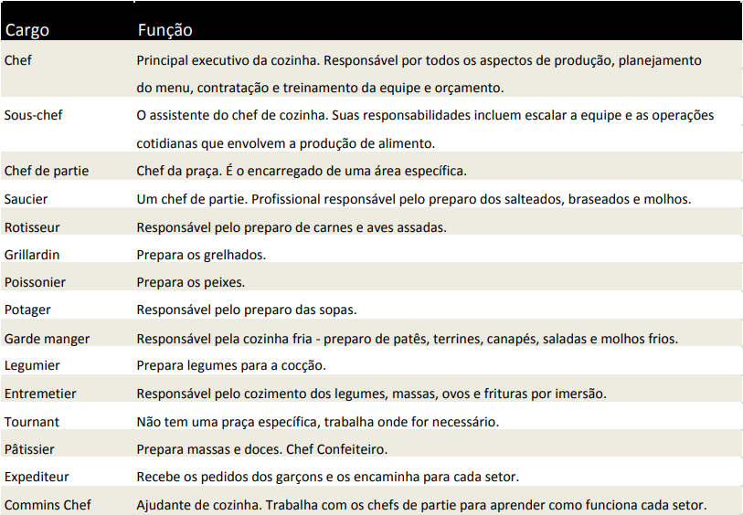 - Responsável pelo planejamento, direção e supervisão dos demais colaboradores. Conhece e domina a grande maioria das produções clássicas de uma cozinha;