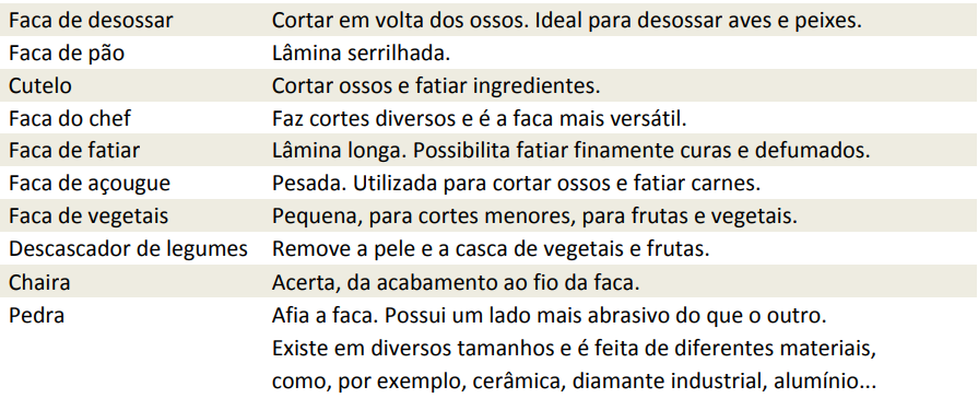 PRINCIPAIS FACAS E UTENSÍLIOS DE COZINHA: