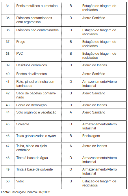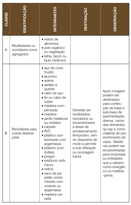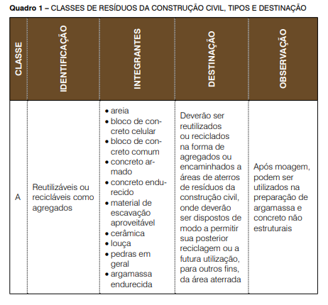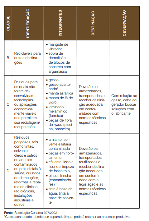 Existem quatro classes de resíduos da construção civil determinadas pelas Resoluções Conama 307/2002 e 348/2004, conforme quadro abaixo.